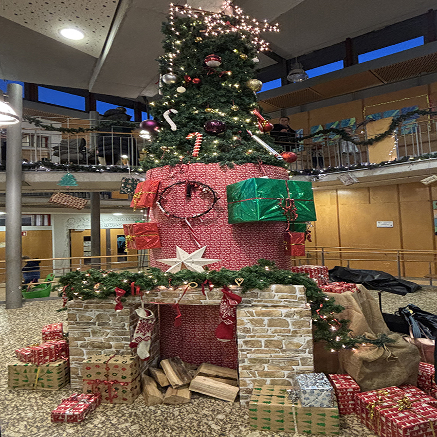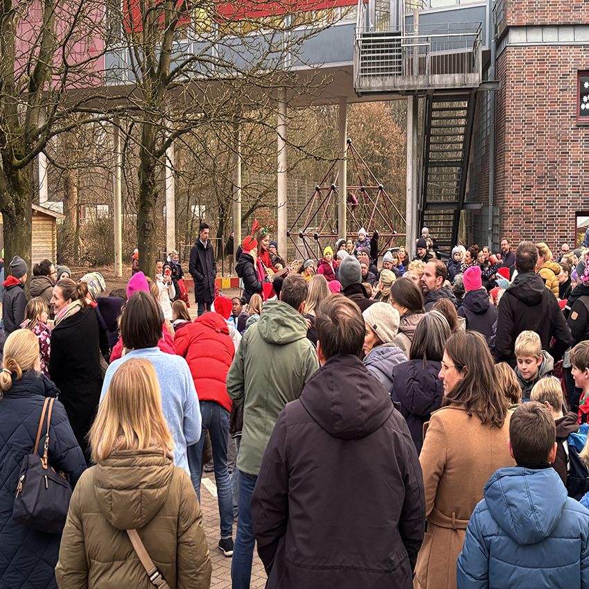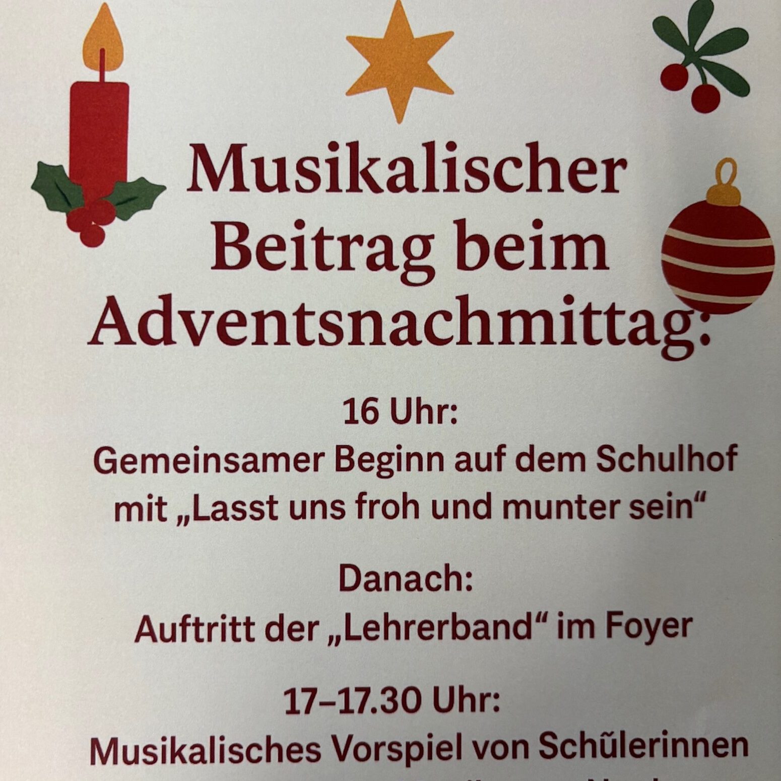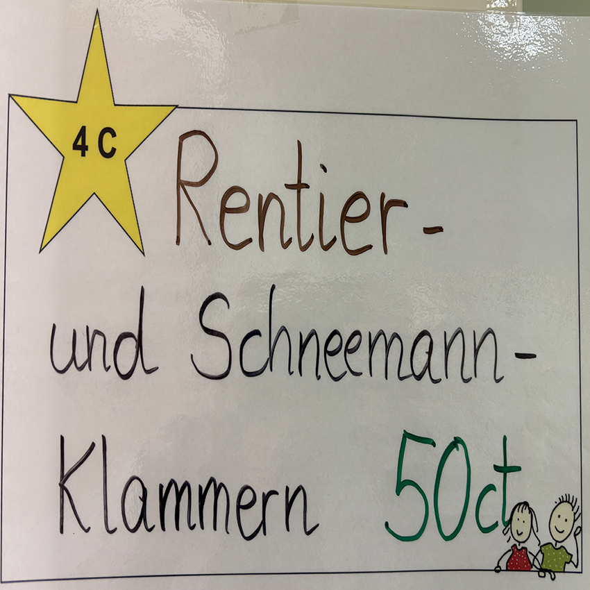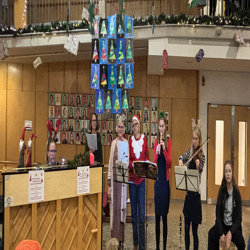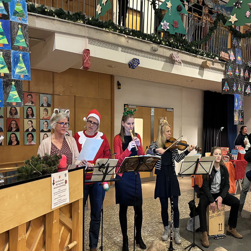 Endlich ging es los! Pünktlich um 16.00 Uhr erklangen auf dem Schulhof die ersten Adventslieder. Dann öffneten sich die Türen und die Bastelangebote und vieles mehr wurden von allen Gästen in Augenschein genommen. Renntiere aus Klammern, Papiersterne, Schlüsselanhänger und vieles mehr konnten gebastelt werden. Punsch wurde gekocht und Waffeln gebacken. Im Elterncafé wurden die köstlichsten Kuchen angeboten. Der Erlös kommt einem guten Zweck zugute. Die Lehrerband präsentierte unter großem Beifall ein Medley bekannter Weihnachtslieder. Ein feierliches Vorspiel einiger unserer Schülerinnen und Schüler rundete einen stimmungsvollen Adventsnachmittag ab.