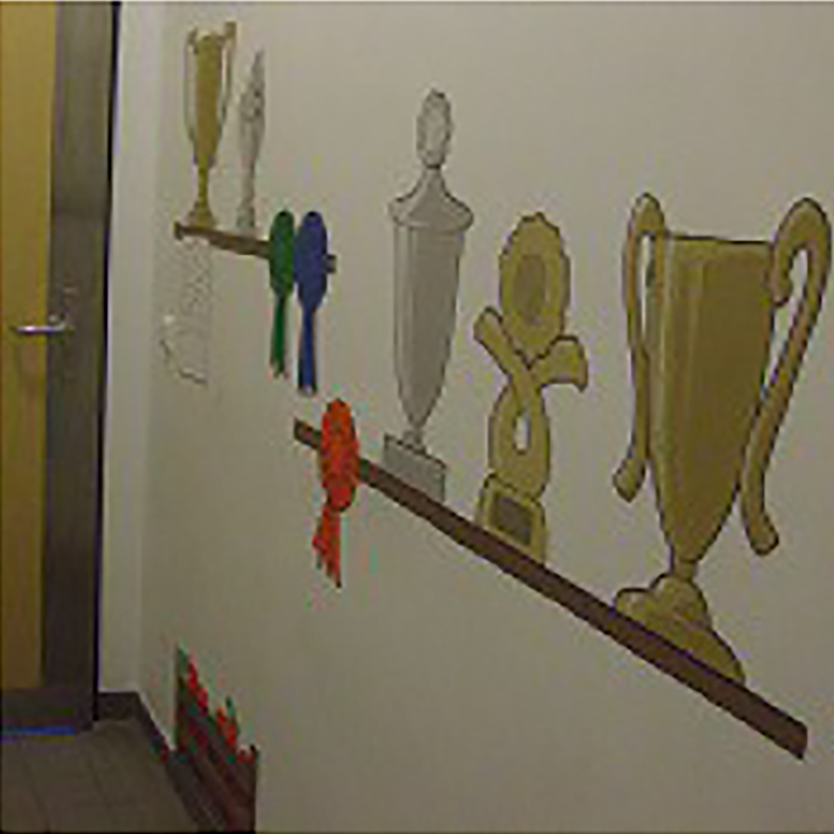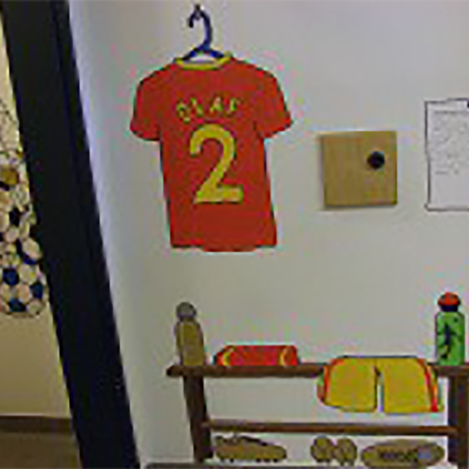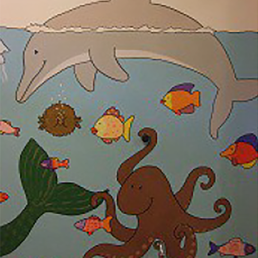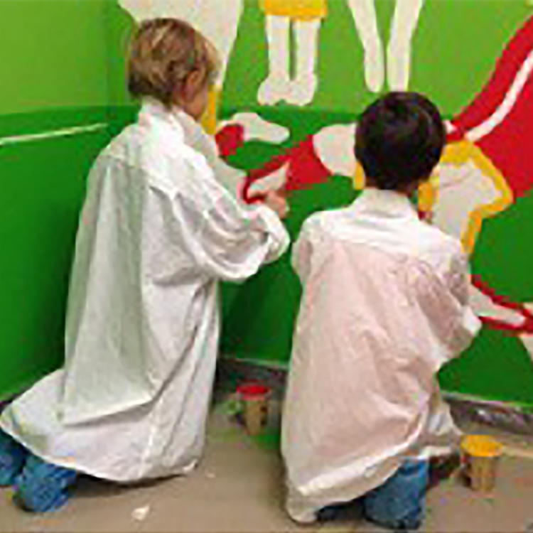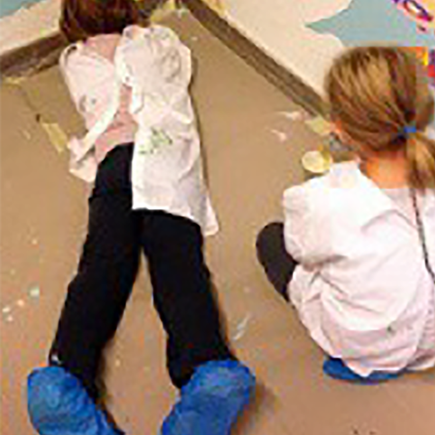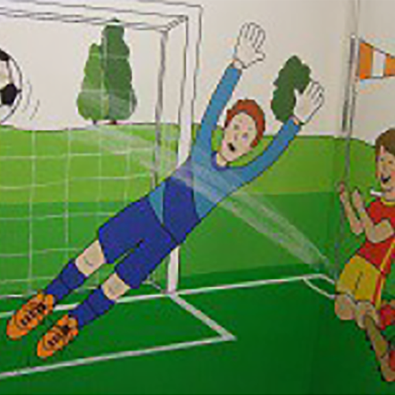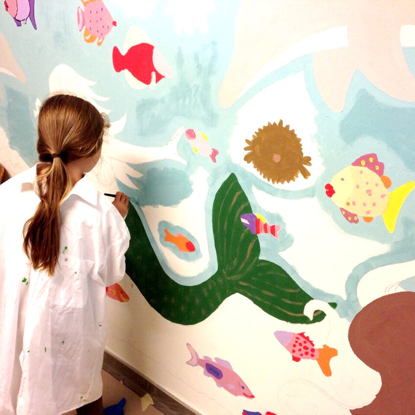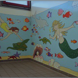 Die Themen für die farbliche Gestaltung der Toiletten in den Obergeschossen haben die Kinder selbst gewählt. Mittlerweile sind sechs Toiletten mit den Themen Unterwasser, Fußball, Pferde, Grusel, Wald und Weltraum zusammen mit der Künstlerin Irena Weißhuhn farblich neu gestaltet.