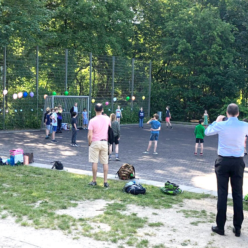 Die Besonderheiten des letzten halben Jahres ließen uns kreativ werden und wir verlegten die Verabschiedung jeder vierten Klasse nach draußen, wo zum Glück sommerliche Temperaturen herrschten. Und so fanden auf unserem Sportplatz kleine Ansprachen statt, es stiegen Wunschkarten für jeden Schüler an einem Luftballon in den Himmel, und die vorher von jedem Schüler für ihre Klassenlehrer aufgenommen umgedichteten Lieder wurden von einem Tonband abgespielt. Auch wenn es anders war- es war schön.