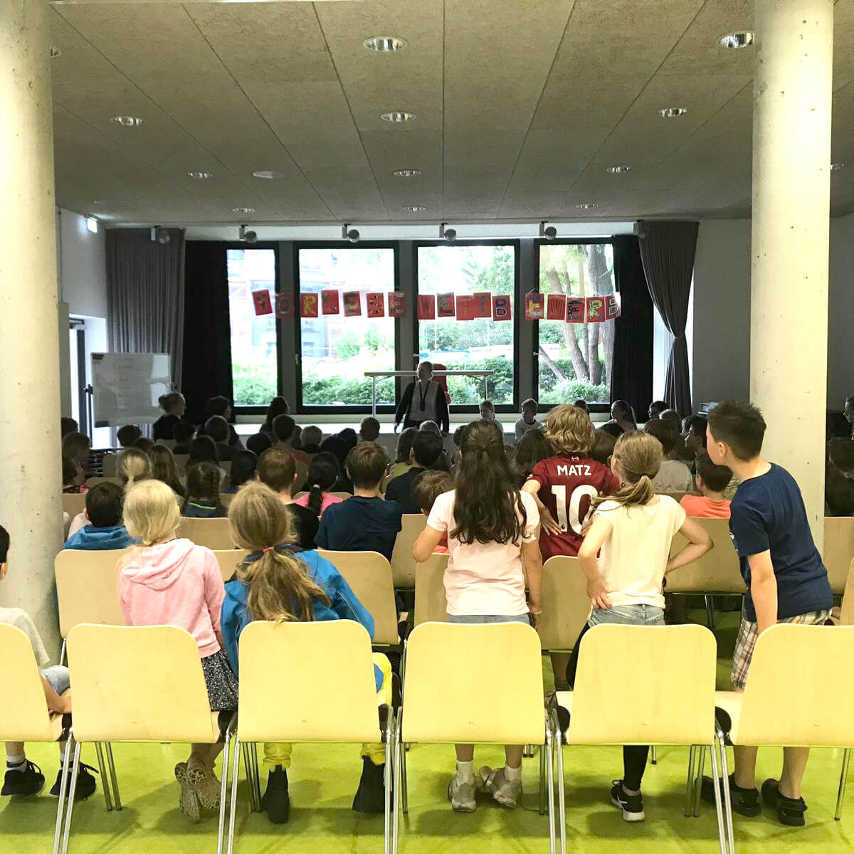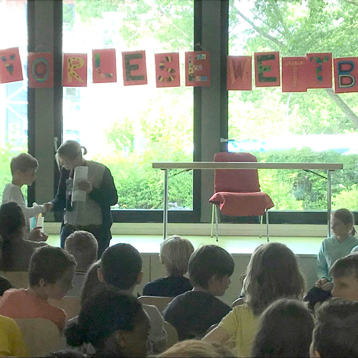 Einmal im Schuljahr findet der Vorlesewettbewerb in der dritten Klassenstufe statt. Alle, die gern daran teilnehmen möchten, stellen sich in ihren Klassen einem Vorentscheid. So werden in jeder Klasse drei Kinder als Kandidaten für den Wettbewerb ausgewählt. Die Aufregung ist jedes Jahr groß, wenn alle dritten Klassen sich im Musiksaal des Neubaus versammeln. Die Bühne ist immer festlich aufgebaut und die Jury, die sich aus wechselnden Juroren zusammensetzt, wartet jedes Jahr schon gespannt auf die Finalisten. Diese lesen zuerst einen geübten Text aus einem Buch und dann noch einen ungeübten Text vor.
