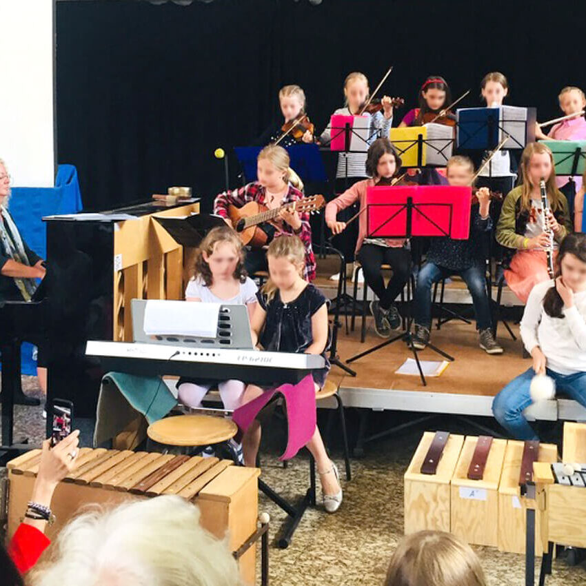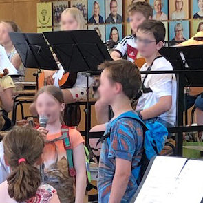 In Ausnahmefällen und je nach entsprechendem Können dürfen auch schon Kinder aus dem 2. Jahrgang im Orchester mitspielen