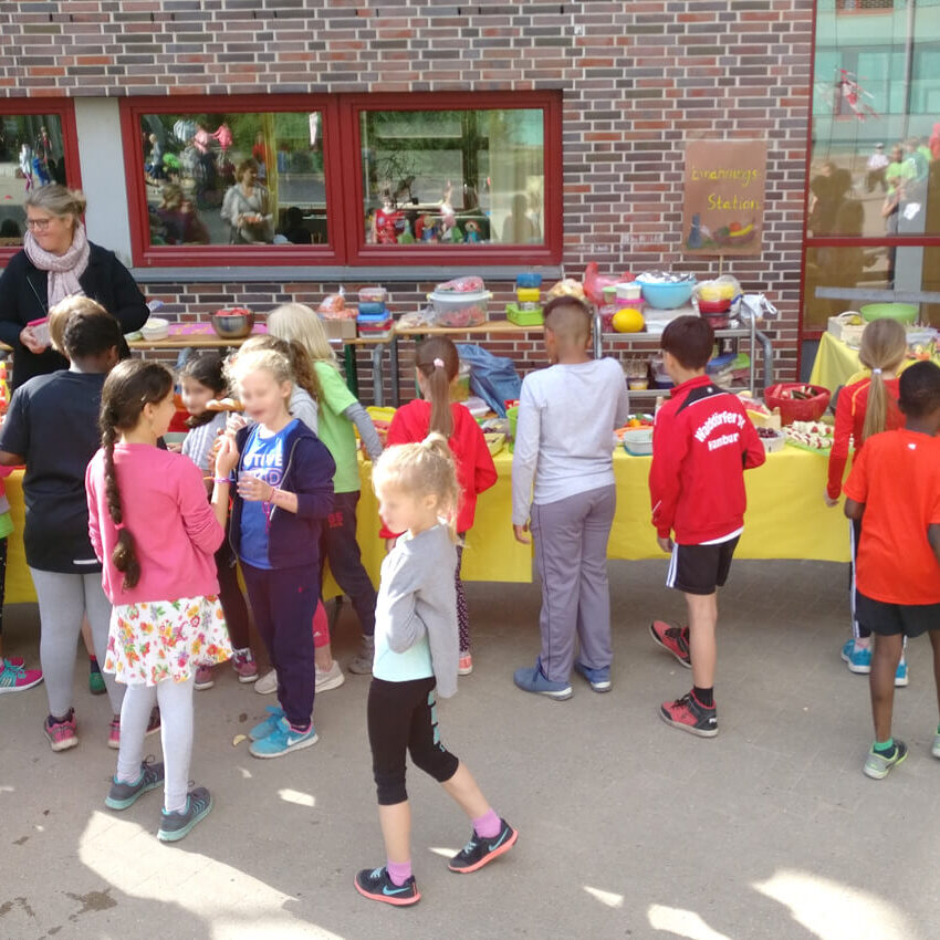 Gestartet wird das Sportfest mit einem Lauf durch die Horst und abgerundet durch ein köstliches Obst- und Gemüse-Buffet, zu dem alle Beteiligten etwas beigesteuern.